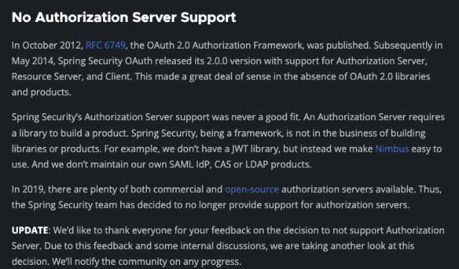 결론적으로 처음에는 OAuth2.0관련 제품이 없을 때는 의미가 있었는데 인증서버 오픈소스들이 많이 나왔고 스프링시큐리티의 취지에 맞지 않아서 제공하지 않는것으로 보입니다.