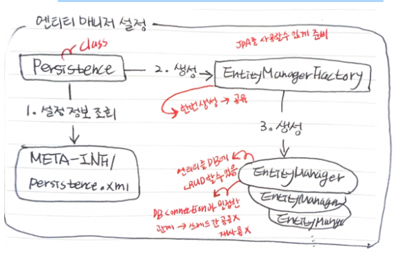 • EntityManagerFactory는 Persistence class를 가지고 JPA를 사용할 수 있게 준비를 해주는데 한번만 생성하여 공유하는게 좋습니다.