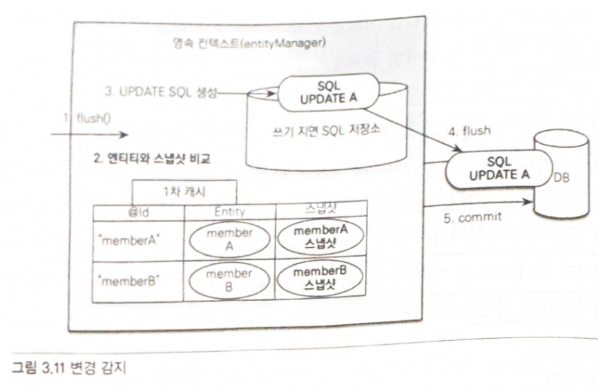 - 그리고 플러시 시점에 스냅샷과 엔티티를 비교해서 변경된 엔티티를 찾습니다.