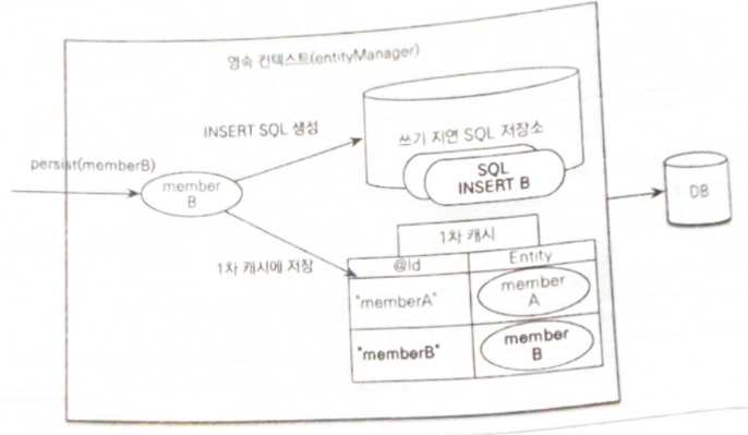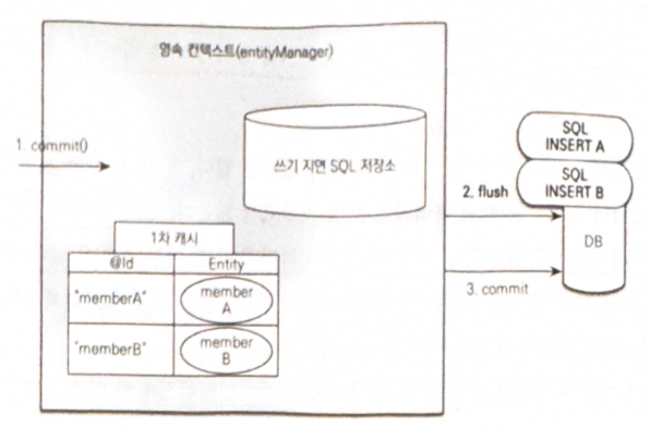 - 엔티티 매니저는 트랜잭션을 커밋하기 직전까지 데이터베이스에 엔티티를 저장하지 않고 내부 쿼리 저장소에 SQL을 차곡차곡 모아둡니다.