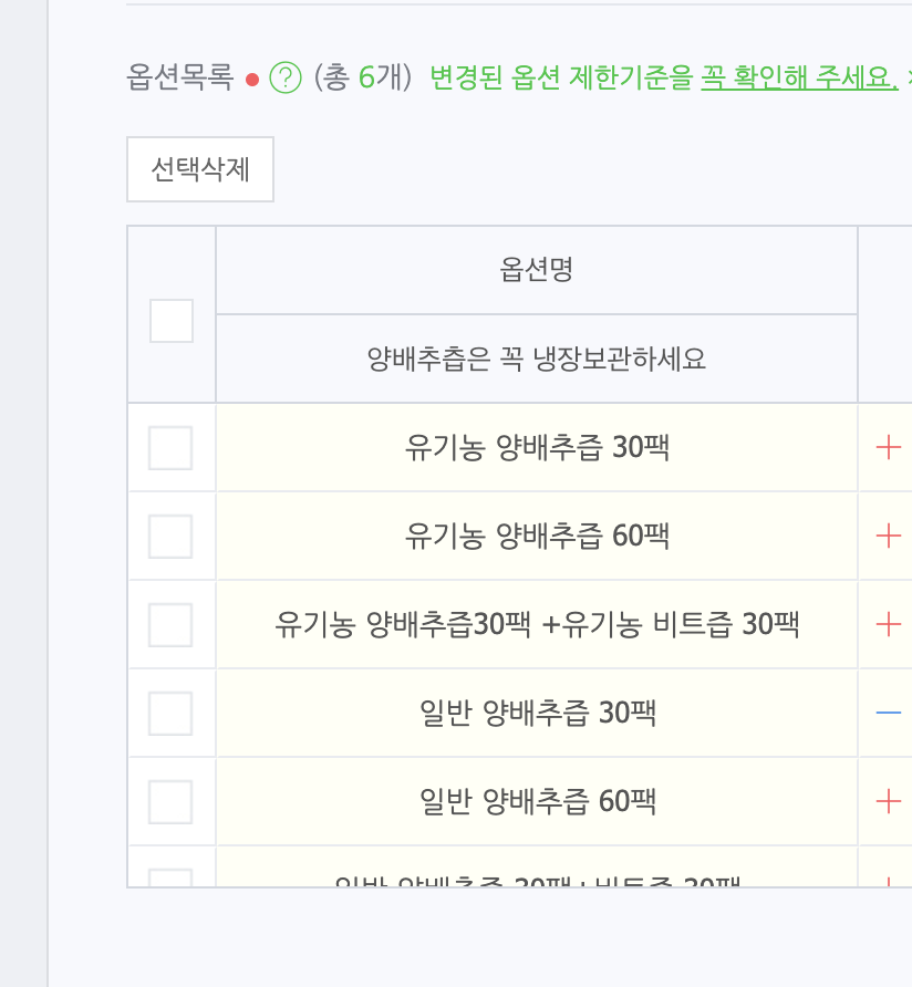아래와 같이 기존 파는 상품에 대한 데이터가 옵션 데이터! 그리고 추가상품이다.