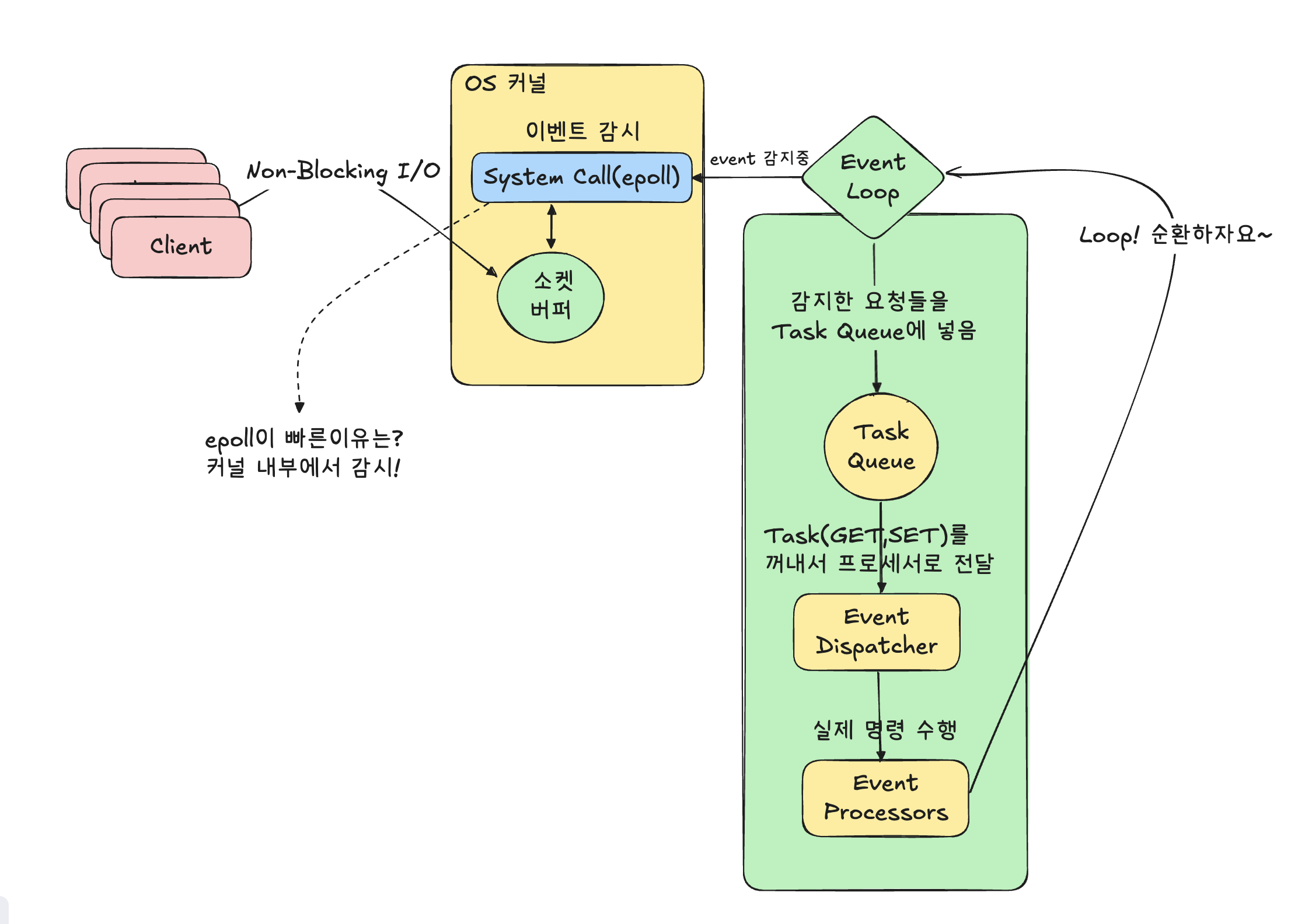 Non-Blocking I/O + OS커널(epoll) + Event Loop 삼대장을 조금 디테일하게 그려보면 아래와 같습니다.