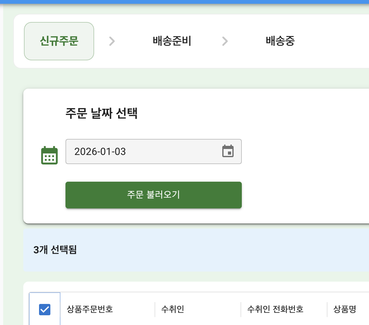 저장 후 등록을 하면 자동으로 배송준비탭으로 넘어가며 발주처리를 하기 위한 리스트들이 보인다.