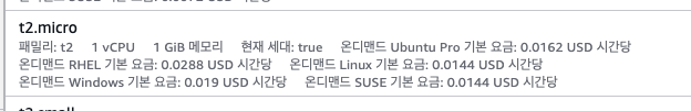 가격도 아래와 같이 t2.micro는 리눅스 기본요금 : 0.0144USD 시간당