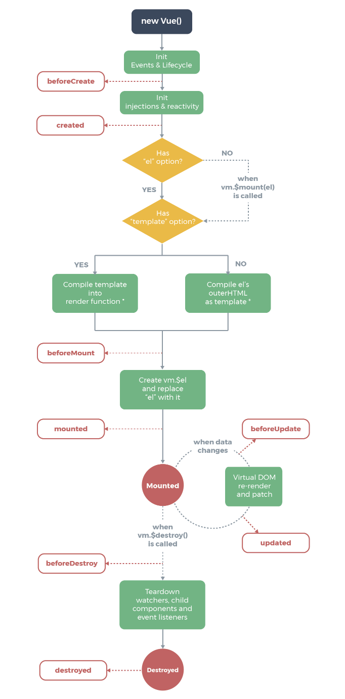 종류로 created, mounted, updated, destroyed 가 있으며 created 훅의 경우 인스턴스가 생성된 후에 호출된다.