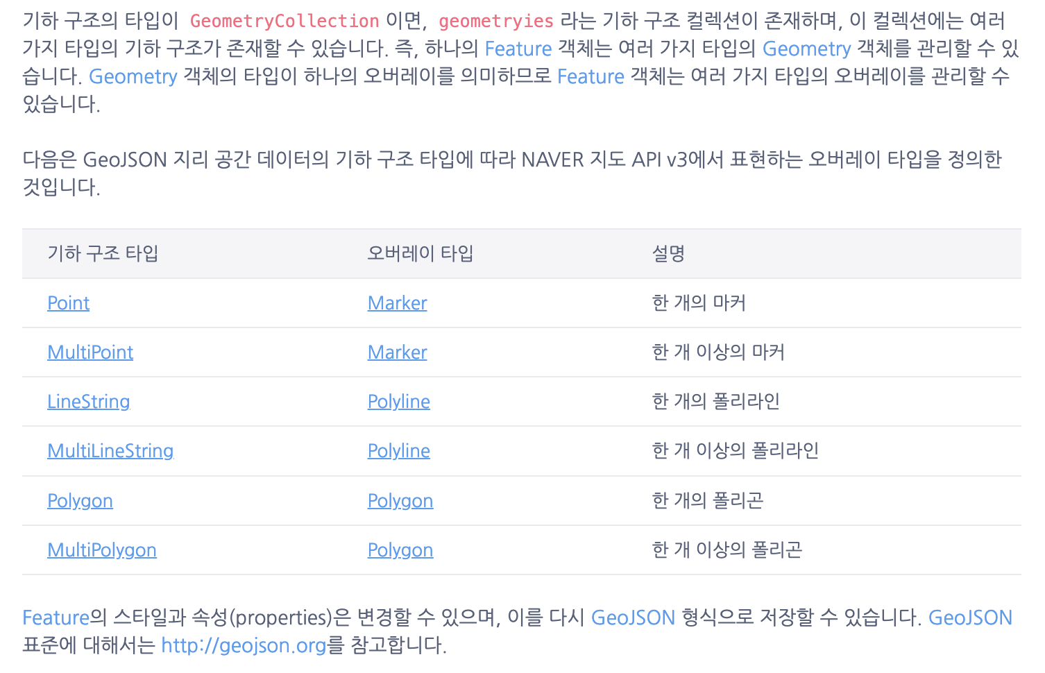 GeoJSON, KML, GPX형식의 지리 공간 데이터를 지도 위에 표현할 수 있으며, 반대로 표시된 데이터를