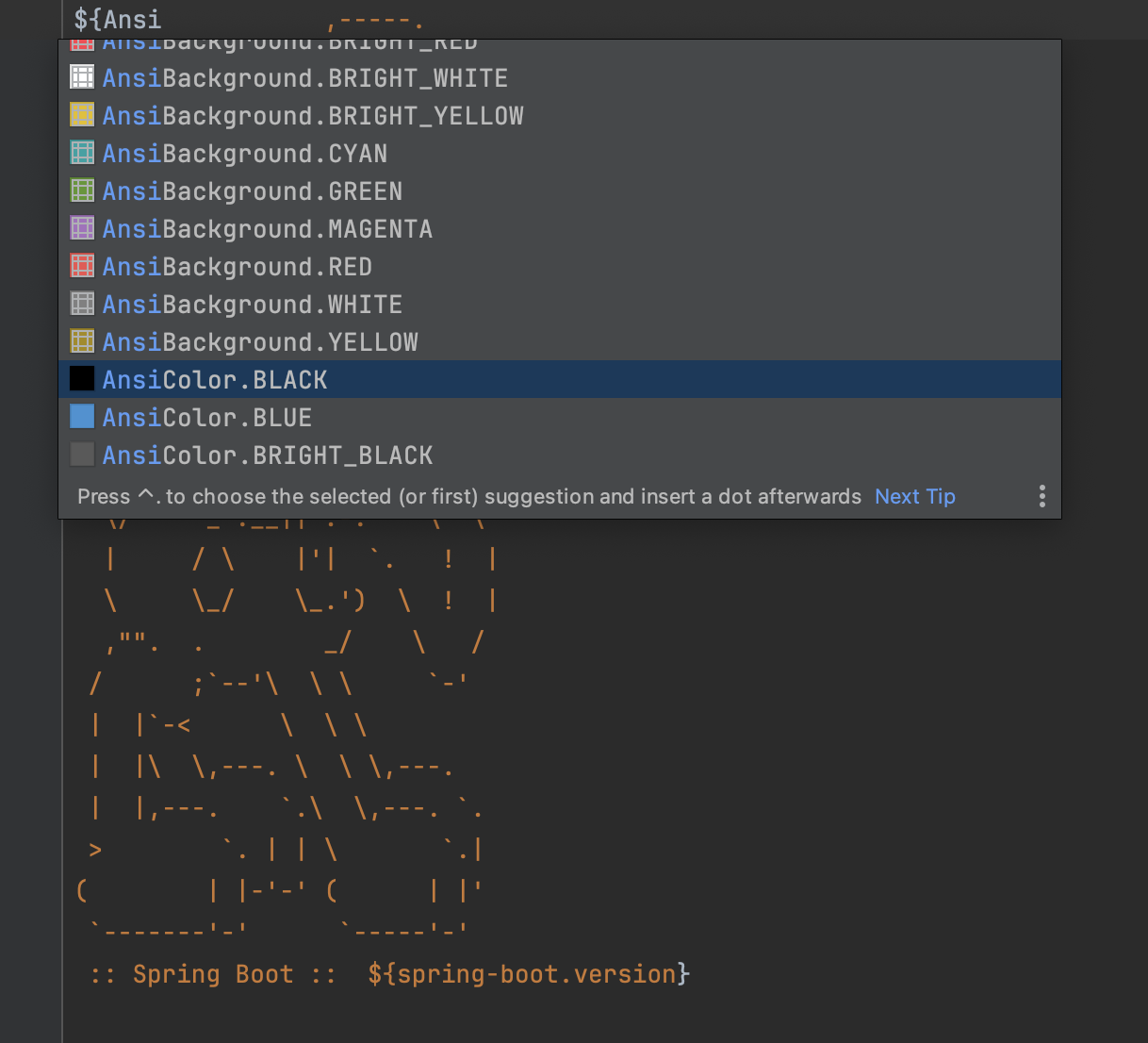 | ${Ansi.NAME} (or ${AnsiColor.NAME}, ${AnsiBackground.NAME}, ${AnsiStyle.NAME}) | Where NAME is the name of an ANSI escape code. See AnsiPropertySource for details. |
