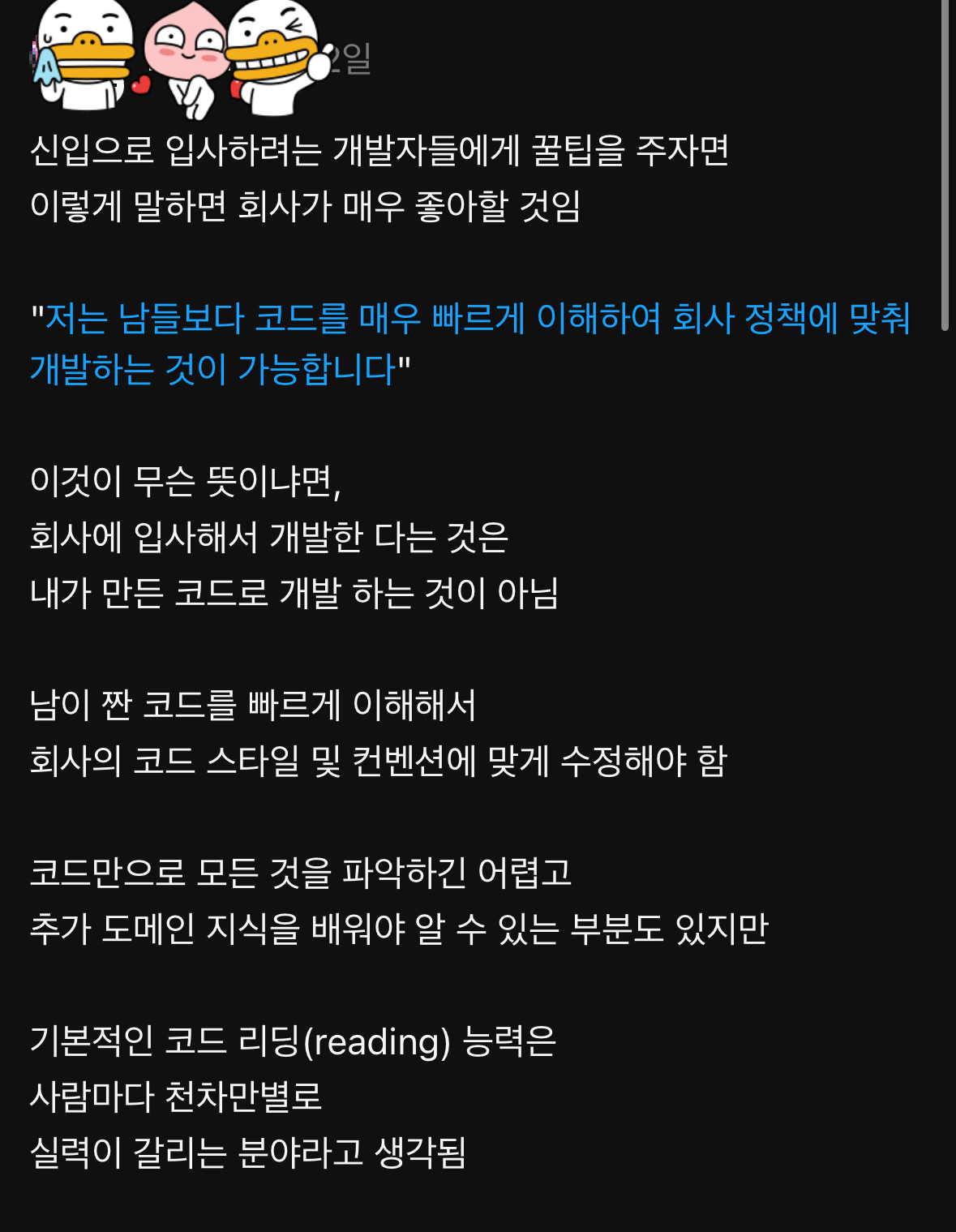 아래의 글을 보면서 코드리딩능력과 코드컨벤션에 맞게 개발가능하다라는것을 어필하라고 했는데..