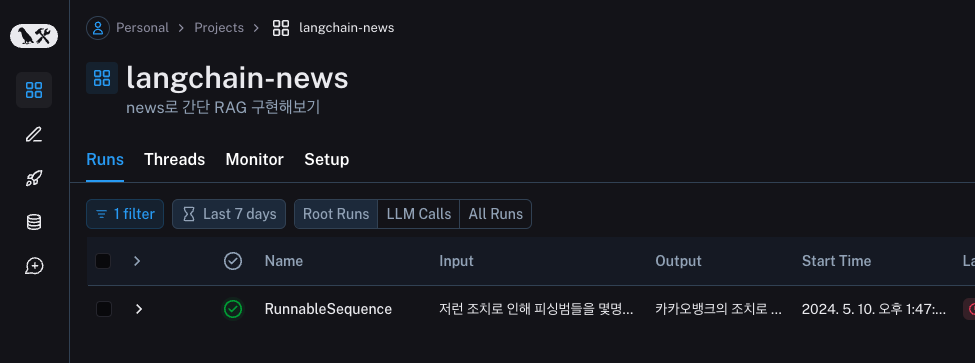 프로젝트를 만든 뒤에 LLM에 invoke를 했을 때 다음과 같이 tracing이 되면 성공 입니다.