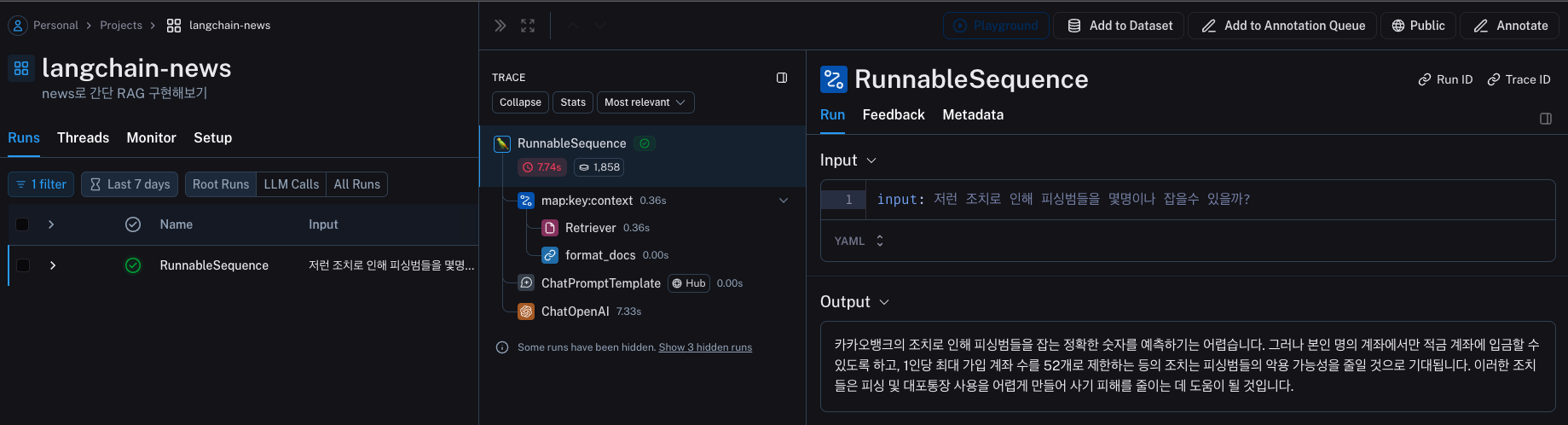 https://smith.langchain.com/에 접속해서 자신이 만든 프로젝트를 선택해서 들어가면