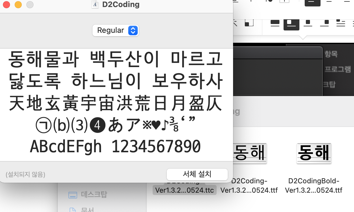 서체 변경은 https://github.com/naver/d2codingfont/releases/tag/VER1.3.2 (2021.08.14 수정)에서
