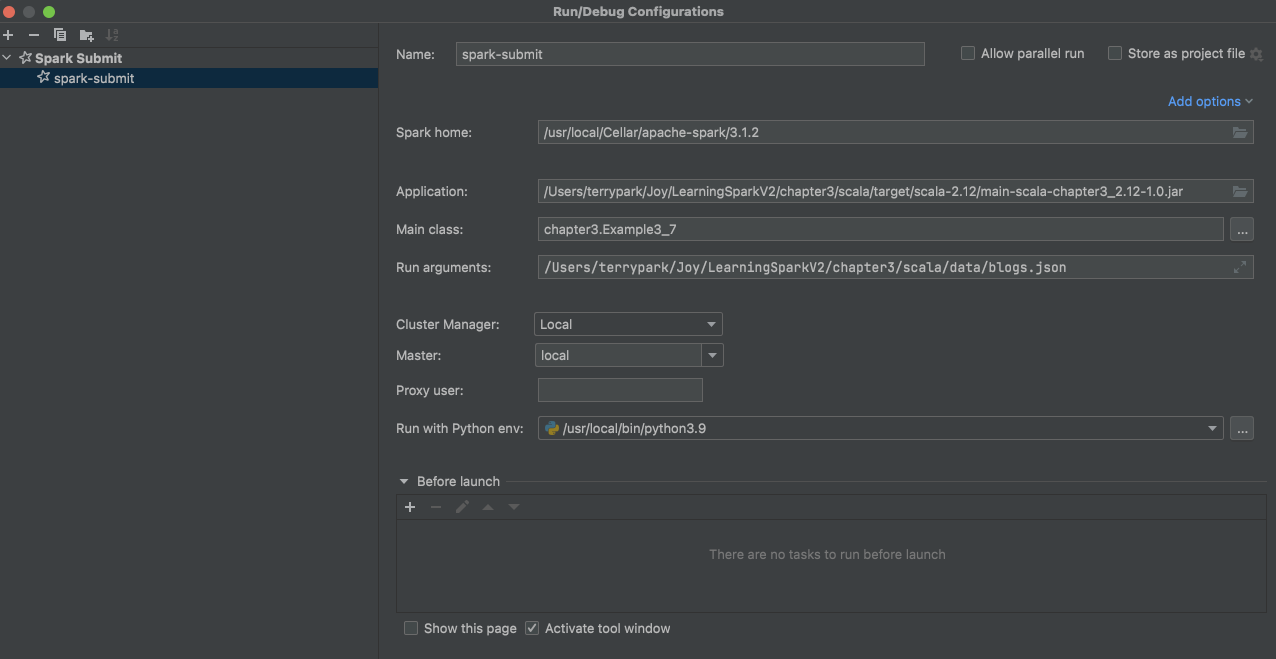 /usr/local/Cellar/apache-spark/3.1.2/bin/spark-submit --master local --deploy-mode client --class chapter3.Example3_7 --name spark-submit --driver-memory 1024M --driver-cores 1 --executor-memory 1G /Users/terrypark/Joy/LearningSparkV2/chapter3/scala/target/scala-2.12/main-scala-chapter3_2.12-1.0.jar /Users/terrypark/Joy/LearningSparkV2/chapter3/scala/data/blogs.json