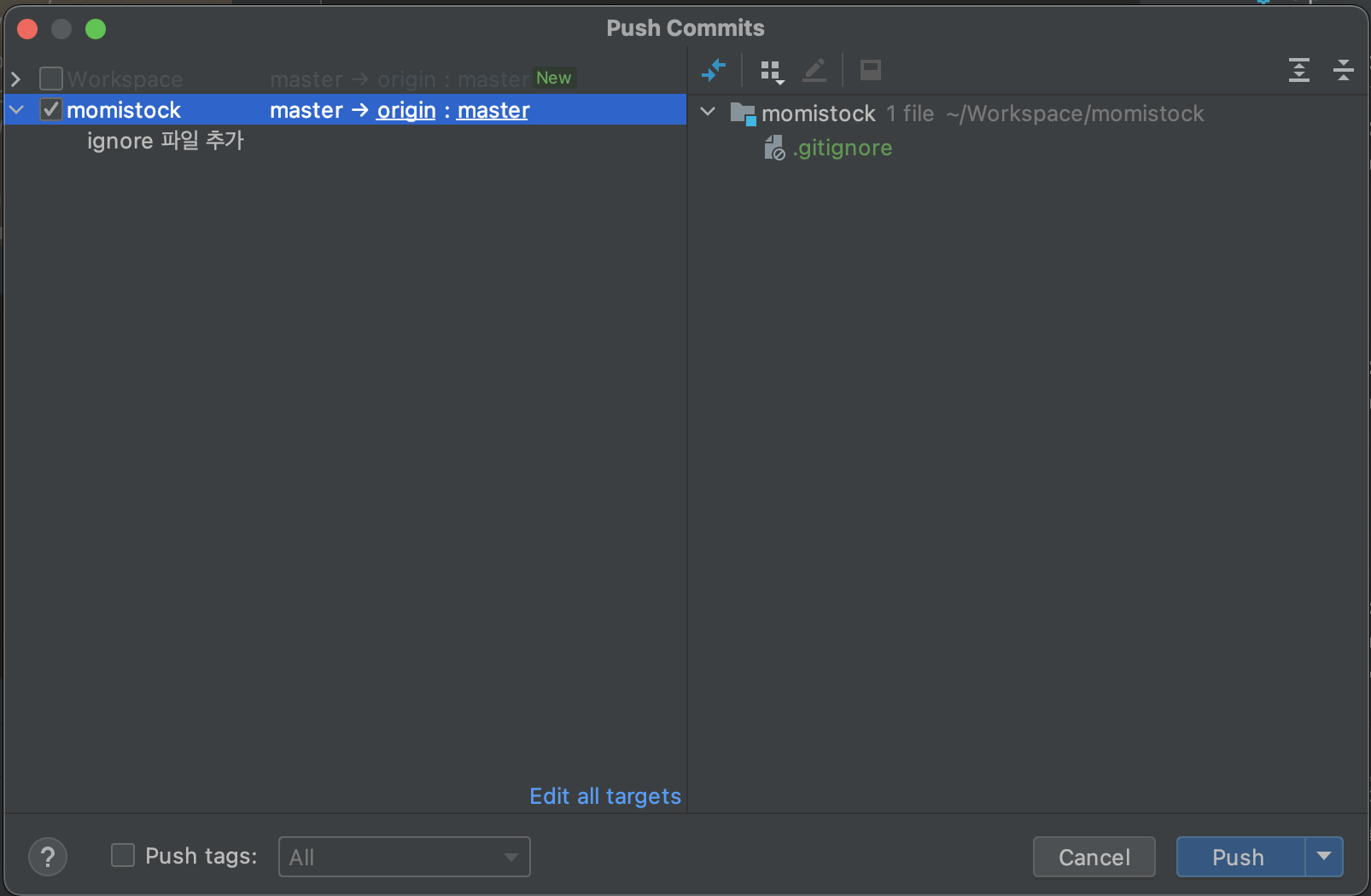 커밋을 할 때 저번에는 선택을 해줬어야 했는데 이제는 선택사항없이 .gitignore파일만 커밋 대상으로 잡혔습니다.