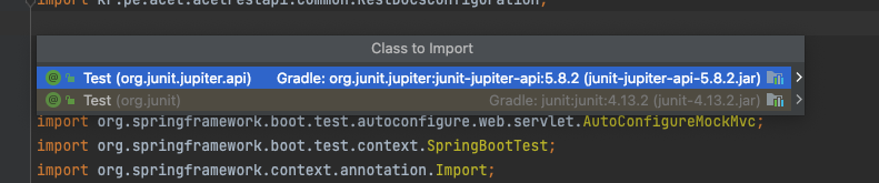 Junit5를 사용하고 있으므로 아래처럼 jupiter 어쩌구로 import 해줘야 한다.