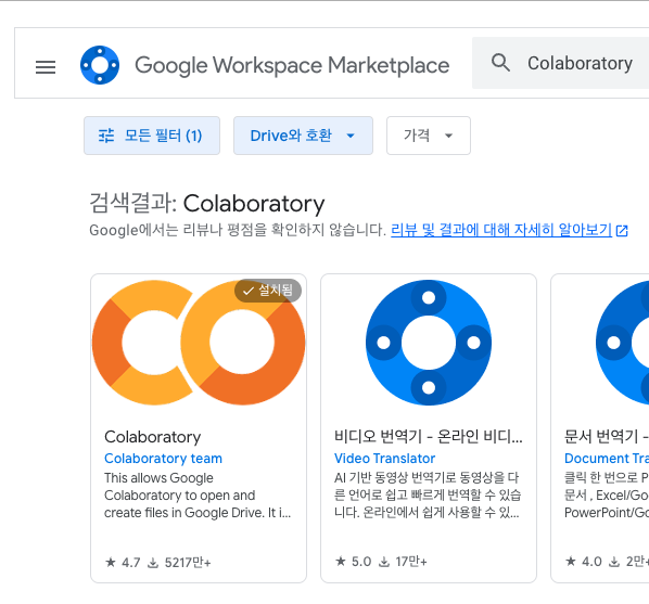 더보기 > 연결할 앱 더보기 > Colaboratory로 검색 > 설치!