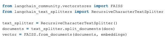 아래의 소스처럼 load한 docs를 쪼갠 뒤에 FAISS( Facebook AI Similarity Search) vector store에 저장 합니다.